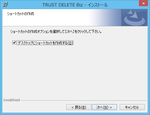 「ショートカットの作成」画面が表示されます。デスクトップにショートカットを作成したい場合は、「デスクトップにショートカットを作成する」にチェックが入っていることを確認し、[次へ]をクリックします。