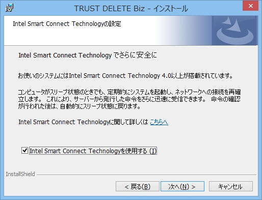 Intel Smart Connect Technologyが搭載されたパソコンでは「Intel Smart Connect Technologyの設定」画面が表示されます。Intel Smart Connect Technologyを利用したい場合は、「Intel Smart Connect Technologyを使用する」にチェックを入れて、[次へ]をクリックします。